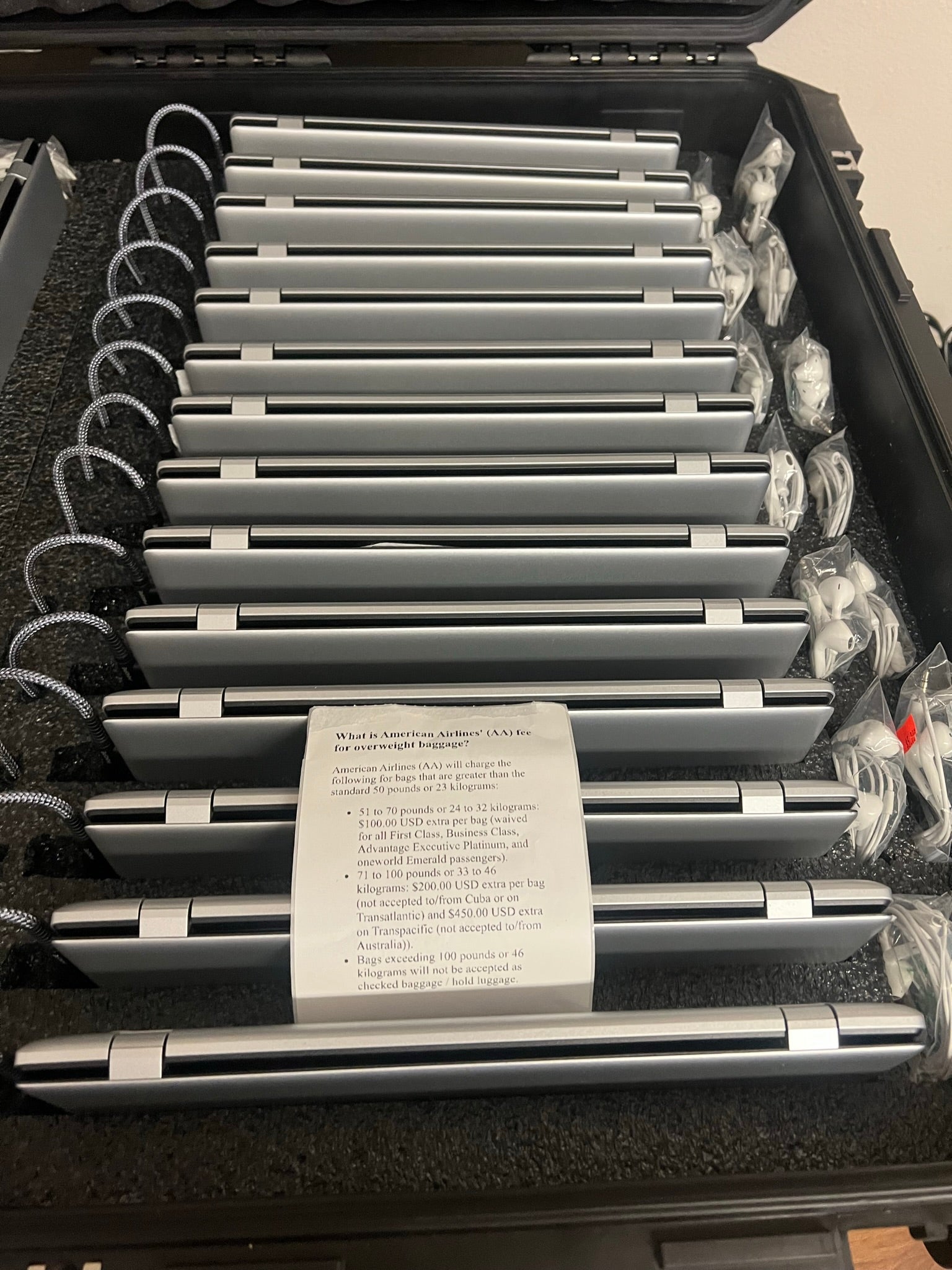 Get everything you need to deploy RACHEL with 10 brand-new Chromebooks in a wheeled charging case with a single power supply. This kit weighs 65 lbs. It is fully loaded for plug-and-play use in any remote area. RACHEL is fully mounted and integrated into the kit with an important heat sink attached to the back of RACHEL for use and charging. Chromebooks are 11.6" with all recommended specifications for use in rural settings. 20 pack costs more as larger case, USB charging hubs and extra devices add costs.